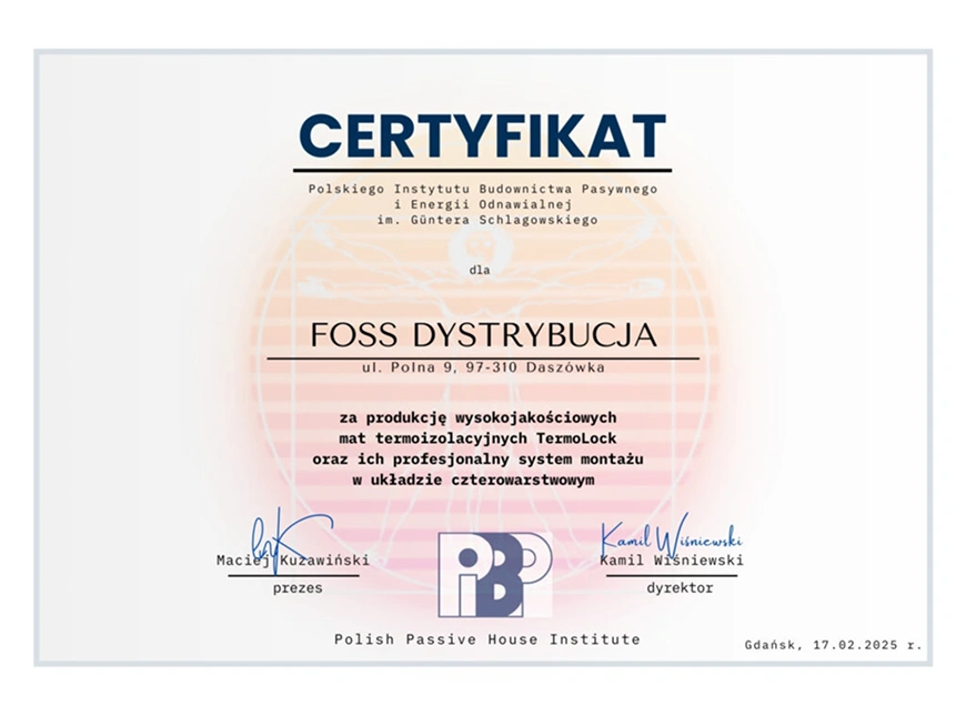Certyfikat potwierdzający skuteczność izolacji termicznej Termolock® przez jedyny w Polsce instytut certyfikowany Passivhaus Institut z Darmstadt